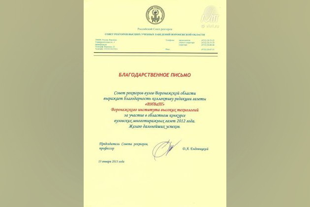 Газета «ВИВаТ!» отмечена благодарственным письмом Совета ректоров вузов Воронежской области