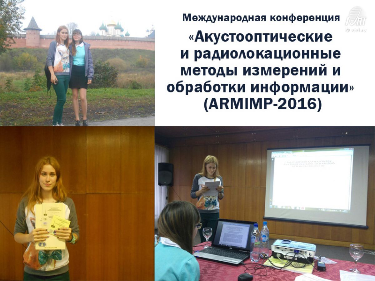 С 2 по 5 октября в Суздали состоялась девятая Международная конференция "Акустооптические и радиолокационные методы измерений и обработки информации" (ARMIMP-2016). На конференции Воронежский институт высоких технологий представляли студенты Ирина Гусарова и Татьяна Губина. В их докладе были показаны возможности уточнения уровней излучения в современных системах связи за счет использования комбинированных методов.