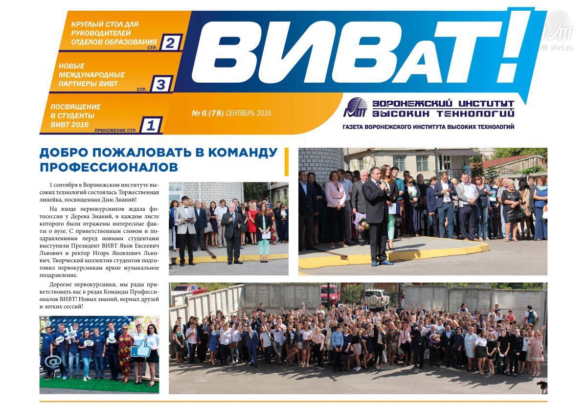 26-29 сентября 2016 г. в Государственном музее Аушвиц-Биркенау (г. Освенцим, Республика Польша) состоялся образовательный семинар «Аушвиц – история и символика». В результате переговоров проректора ВИВТ по международным отношениям Натальи Тимофеевой с заместителем директора Государственного музея Аушвиц-Биркенау и руководителем Международного центра образования об Аушвице и Холокосте Анджеем Кацоржиком было принято решение о расширении сотрудничества, возможности школьных обменов и группового студенческого волонтариата на двухсторонней и трехсторонней основе.18 октября в ВИВТ завершилась акция по сбору макулатуры, организованная командой студентов-волонтёров "Бегущие в ночи". За время акции было собрано 1870 килограмм бумаги.