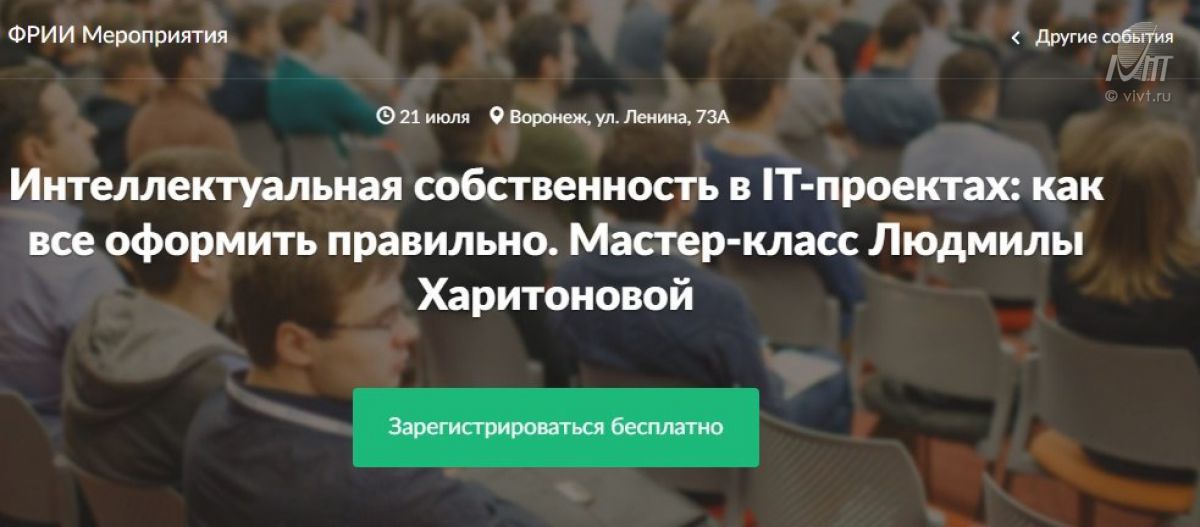 21 июля на базе ВИВТ прошел мастер-класс от управляющего партнера юридической компании «Зарцын и партнеры» Людмилы Харитоновой. Мероприятие было организовано компанией ФРИИ для IT-предпринимателей, основателей стартапов, руководителей и сотрудников веб-студий, чтобы разобраться в вопросах интеллектуальной собственности в IT-проектах и юридических проблемах отношений между заказчиком и разработчиком.