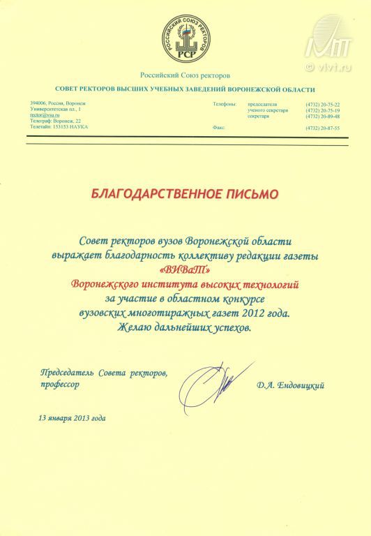 Газета «ВИВаТ!» Воронежского института высоких технологий отмечена благодарственным письмом Совета ректоров вузов Воронежской области.
